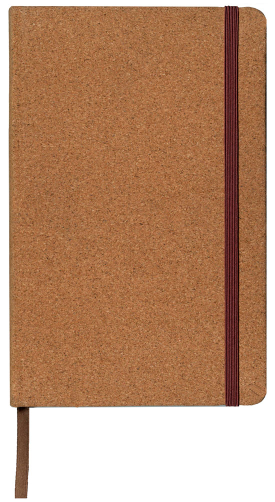 A 5" x 8 1/8" cork perfect bound journal. Lay-flat sewn binding. Has an elastic closure, satin ribbon marker and an expandable inside pocket. Includes 192 ruled cream pages. Pages measure to be 5" x 8".