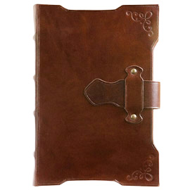 This Hand crafted, genuine Leather 8" x 6" dark brown leather cover with latch closure includes 256 ruled cream pages. Gift boxed.