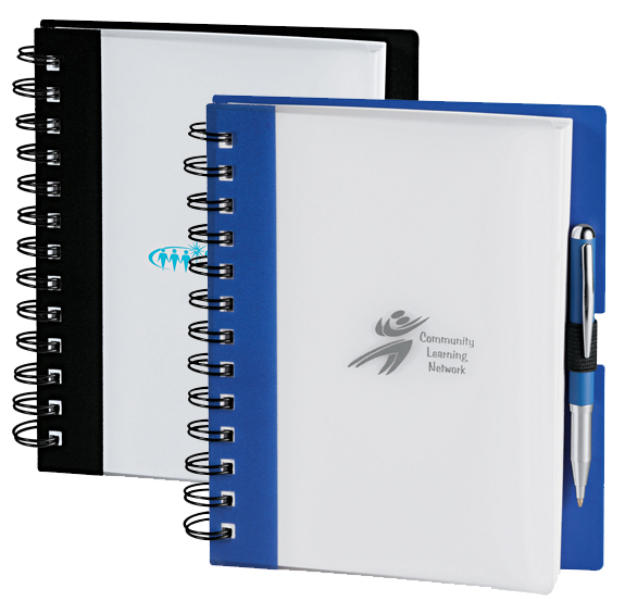 Protective plastic cover. 100 spiral-bound lined pages. Elastic pen loop (pen not included).